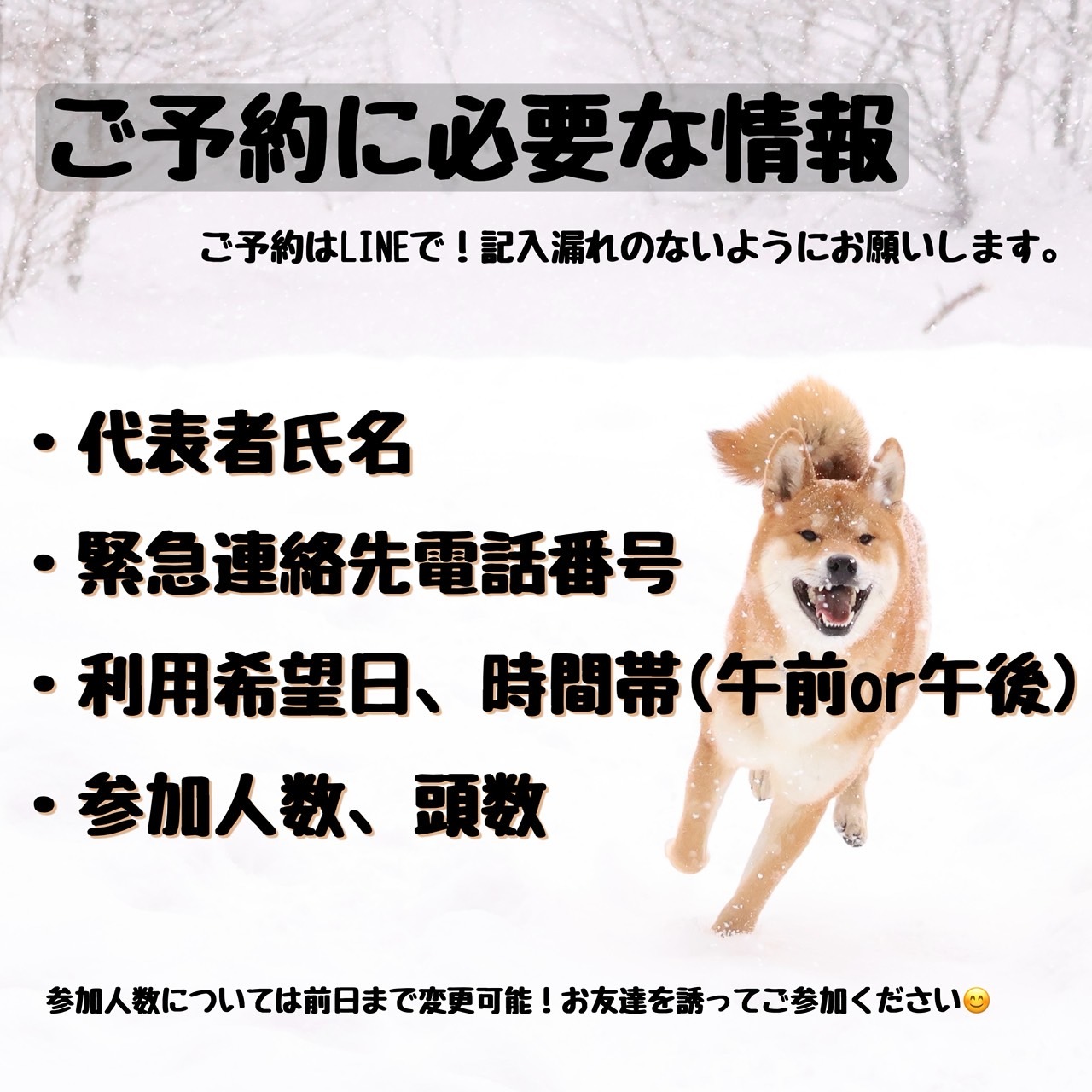 ・冬季ドッグランは雪の為周囲の柵がありません。呼び戻しができないワンちゃんはリード着用でご利用いただきます。(ロングリード無料貸出あります)
